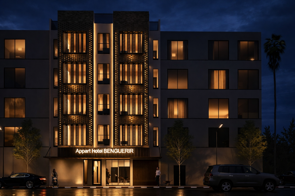 Conçu comme un repère urbain contemporain, cet appart-hôtel combine élégance architecturale et fonctionnalité. La façade est structurée par une composition verticale en briques texturées et brise-soleil, créant un jeu subtil d’ombre et de lumière.